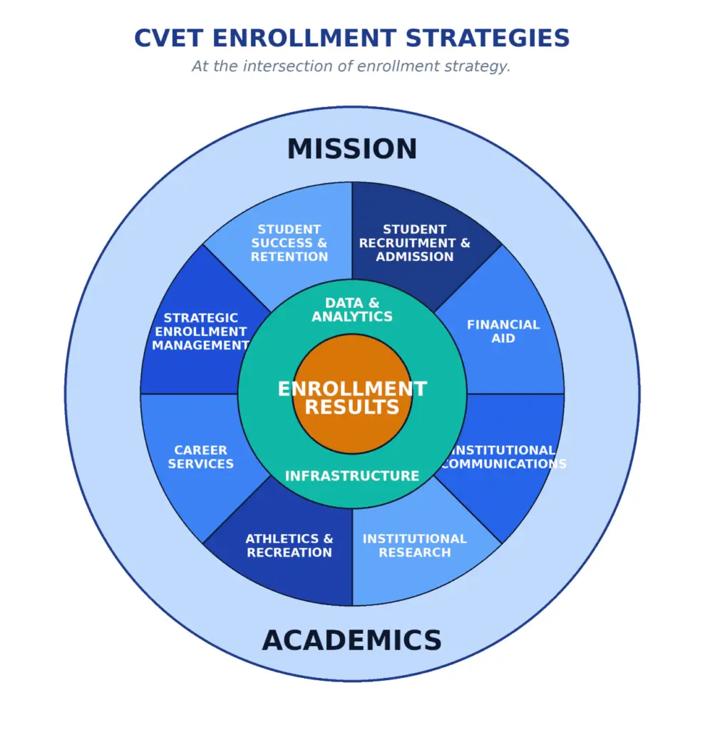 CVET Enrollment Strategies specializes in helping senior leaders and boards understand the enrollment environment and align institutional resources to drive enrollment outcomes. Having led student recruitment, admission, financial aid, communications, athletics and recreation, career services, institutional research and data services, CVET is well positioned to identify opportunities for institutions to drive enrollment.